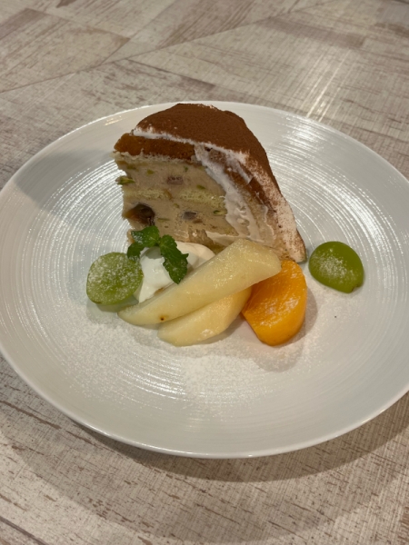 栗のズコット 2025-10-28 04:02:33 秋から始めました。栗のズコット800円です。中のクリームはマスカルポーネチーズを合わせたモンブランクリームです。刻んだ渋皮付きの栗とピスタチオが混ぜてあります。周りのフルーツはその時によって変わります。いつもはモンブランを出てたのですが、今年はちょっと変化球モンブランで栗を楽しんでください🎃🍁🌰
